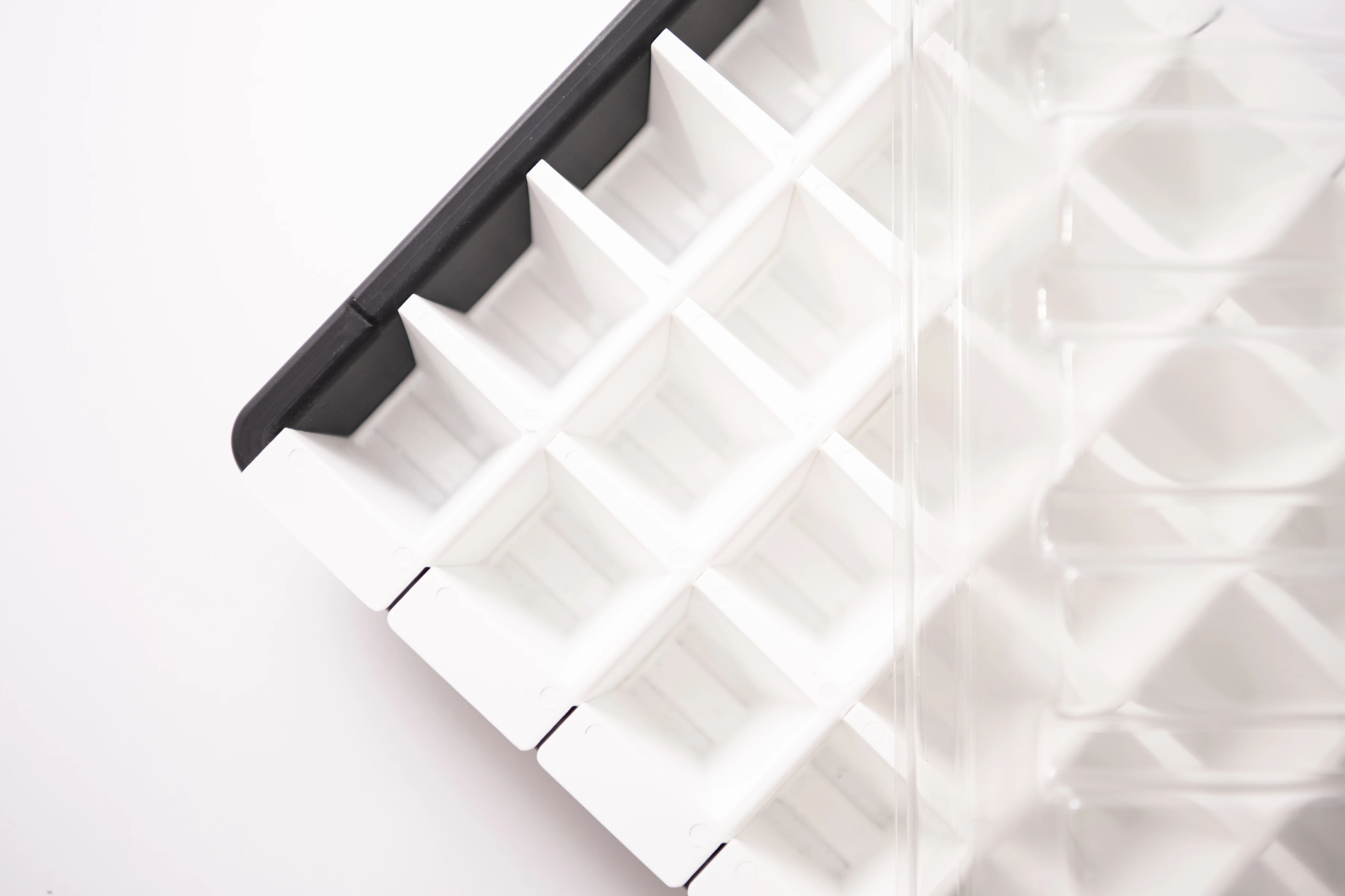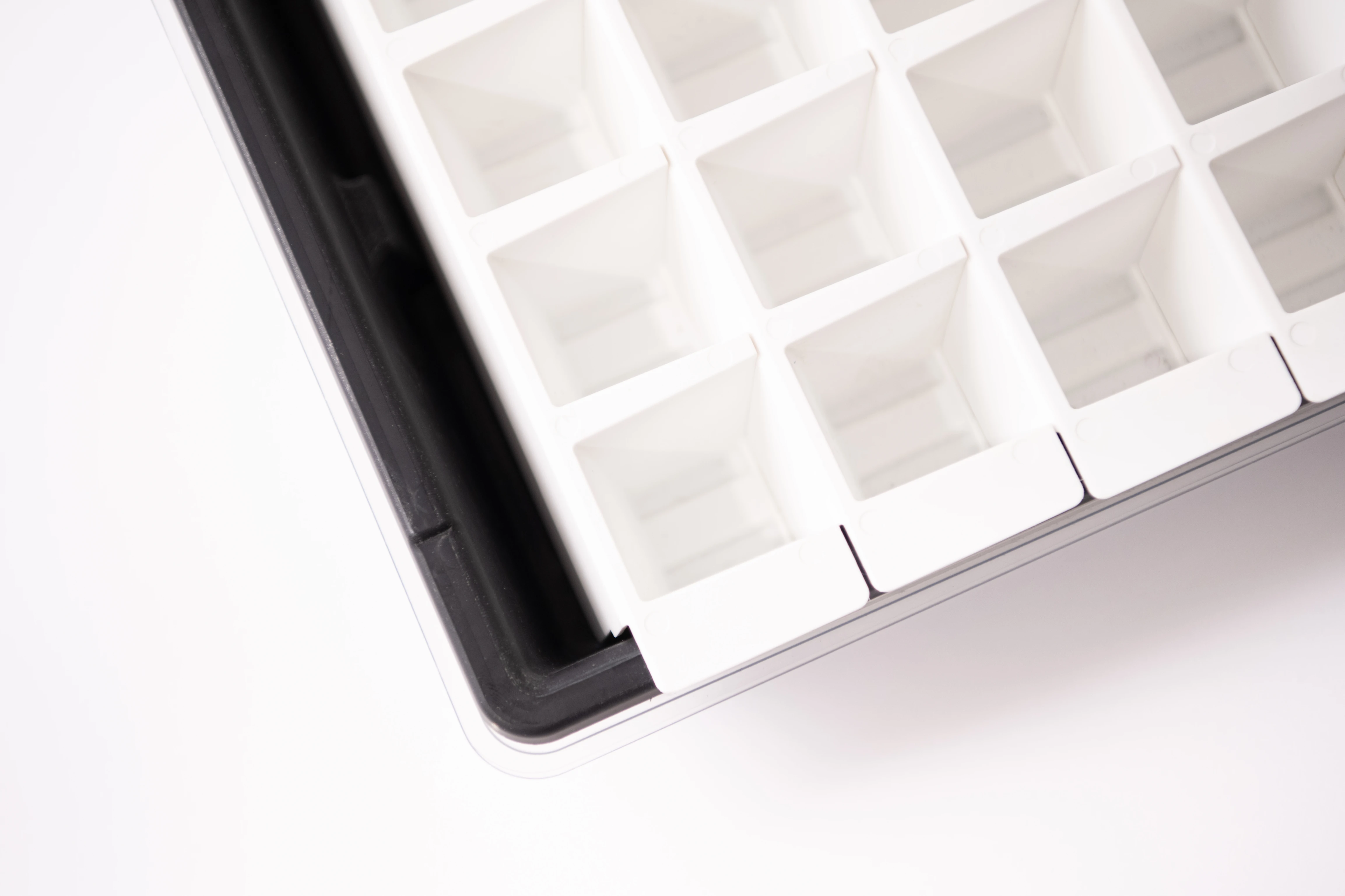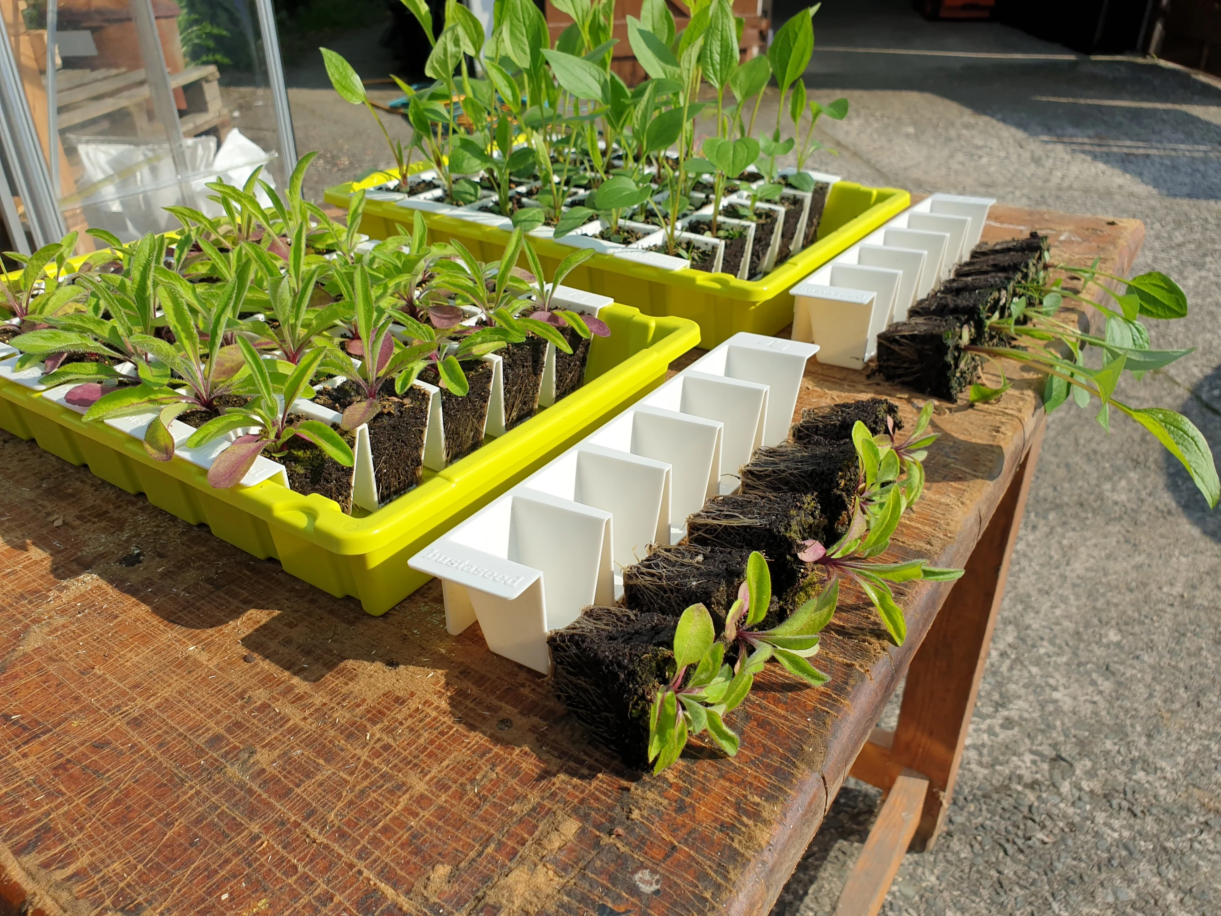 The fully recyclable trays help cut down on both material and plant waste as growers use a novel ‘tip-out’ feature to extract plants. The modular nature of the rows allows the user to monitor the root system health, of each individual cell, during the growing period for signs of poor growing conditions, pests, fungus, mould, and disease. Infected seedlings can be removed to prevent the spread of the problem to the other cells.